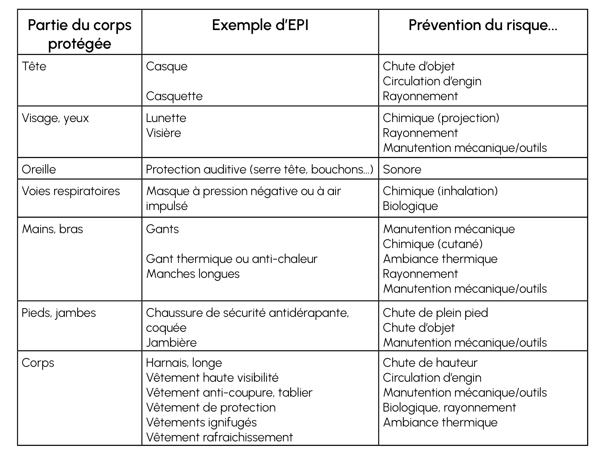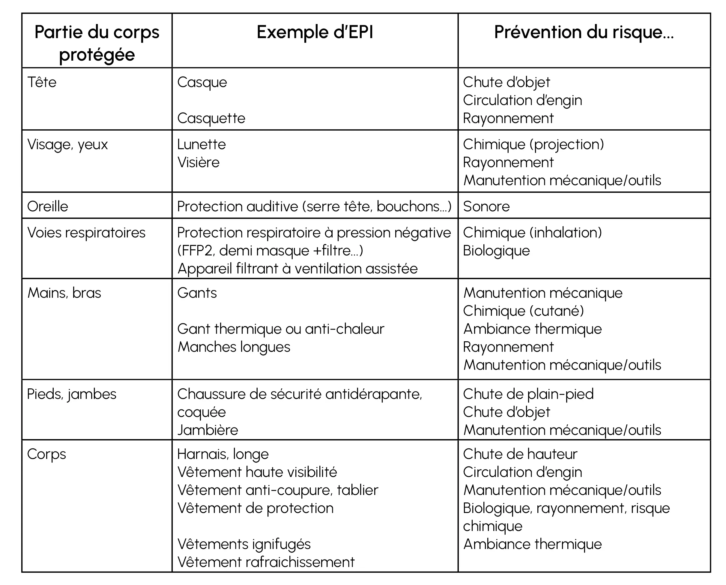 Les équipements de protection individuelle, sont des dispositifs ou moyens destinés à être portés ou tenus par une personne en vue de la protéger contre un ou plusieurs risques susceptibles de menacer sa santé ou sa sécurité (Code du Travail : R4311-8).